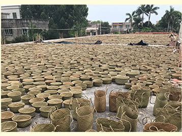 Coiled seagrass is created by coiling thin strands of seagrass with colored plastic strings. This technique produces a sturdy, thick weave that maintains its shape even when carrying heavy loads. Coiled seagrass is commonly used in laundry baskets, storage baskets, baby moses baskets, indoor planters, trays, pet baskets, and wall decor plates. The patterns in coiled seagrass baskets are created by using different plastic strings and require careful attention to detail.